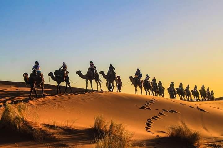 Wenn Sie in der Wüste übernachten, sollten Sie früh aufstehen um die Sonne hinter den Dünen aufgehen zu sehen. Nach dem Frühstück brechen wir mit unseren Dromedaren zu einer Wanderung in die Dünen von Erg Chigaga auf. Nach ca. 2 Stunden erreichen wir unseren Rastplatz, eine große Tamarinde in deren Schatten wir unser Mittagessen zubereitet bekommen. Minztee, im heißen Sand gebackenes Brot, Fleischspieße (Brochette) und natürlich der marokkanische Salat schmecken inmitten der Dünen einfach fantastisch. Abendessen und Übernachtung im Wüstencamp; Musik und Lagerfeuer.