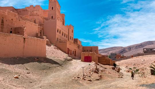 We pick your party up at the Zagora airport/Hotel we travel south towards the west end of the Sahara. The journey continues past Tamegroute (if you wish you can visit a pottery workshop where you can watch the potters at work) and the dunes of Tinfou to Mhamid, once a lonely oasis and an important stage on the old caravan routes. Before Mhamid, we leave the paved road and drive into the desert; if you are lucky, you may see ostriches, antelopes and gazelles; you will certainly come across free-roaming dromedaries and herds of goats. In an adventurous ride in a Land Cruiser on the desert tracks, you will reach the holy oasis of Iriki after approx. 50 km and then continue to the dunes of Erg Chigaga, which extend over an area of approx. 40 km. The golden-coloured dunes reach a height of 300 m and our desert camp is located in the middle of the dunes. Enjoy the hospitality of the nomads, with the famous mint tea, the ‘Whiskey berbère’ as a welcome drink. Lunch at the camp; sandboarding on the dunes and a dromedary ride into the sunset. Dinner and overnight stay in a desert bivouac and nomadic romance.