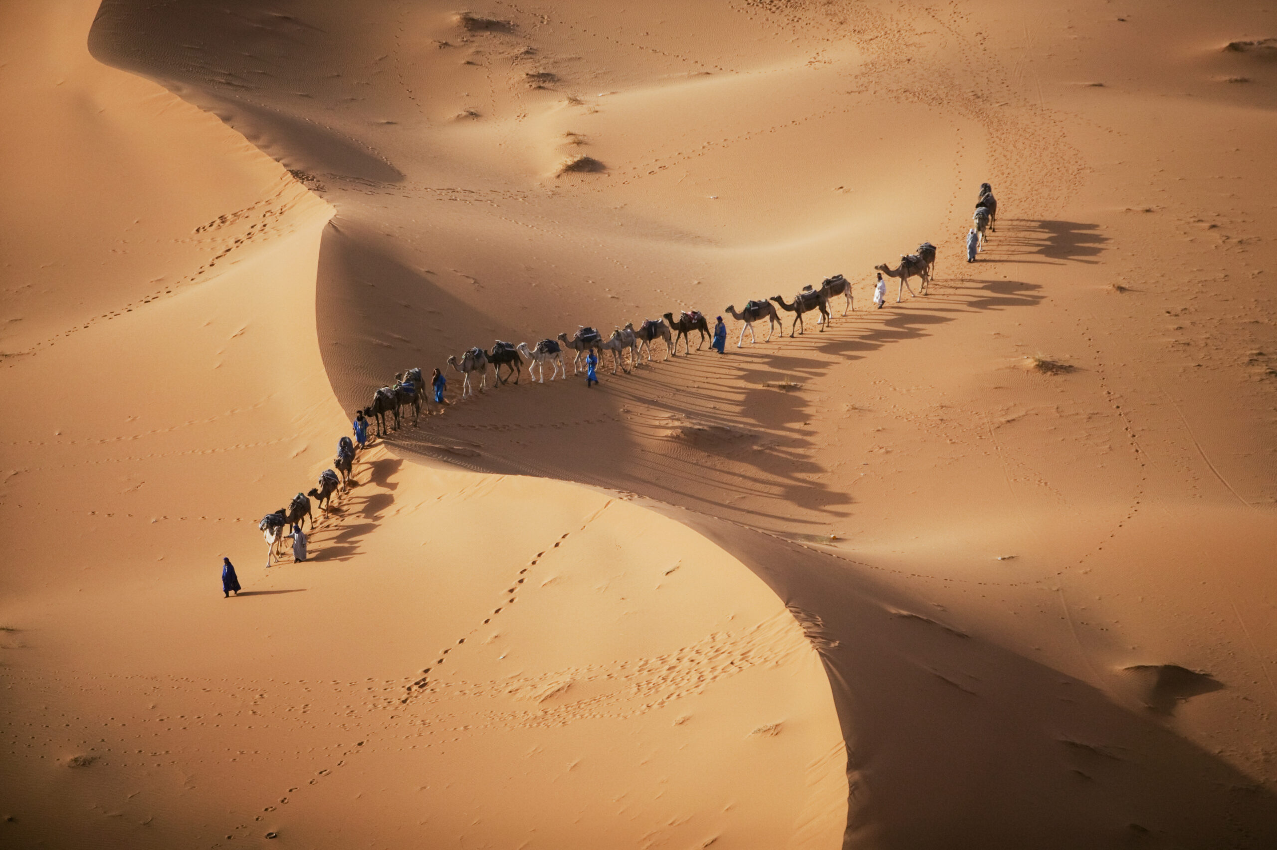 Wenn Sie in der Wüste übernachten, sollten Sie früh aufstehen um die Sonne hinter den Dünen aufgehen zu sehen. Nach dem Frühstück brechen wir mit unseren Dromedaren zu einer Wanderung in die Dünen von Erg Chigaga auf. Nach ca. 2 Stunden erreichen wir unseren Rastplatz, eine große Tamarinde in deren Schatten wir unser Mittagessen zubereitet bekommen. Minztee, im heißen Sand gebackenes Brot, Fleischspieße (Brochette) und natürlich der marokkanische Salat schmecken inmitten der Dünen einfach fantastisch. Abendessen und Übernachtung im Wüstencamp; Musik und Lagerfeuer.