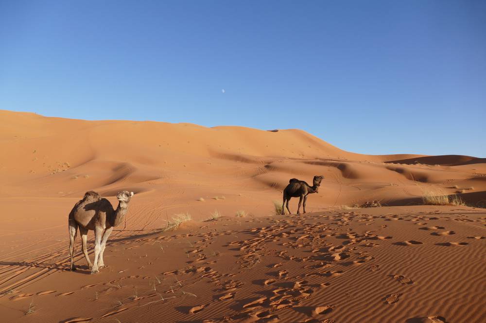 Nach dem Frühstück fahren Sie weiter in die faszinierende Todraschlucht. Die Straße führt nach Tinerhir zuerst durch grüne Palmenhaine und ockerfarbene Berberdörfer bis Sie die Todraschlucht erreichen und hohe Felswände die Straße fast umschließen. Nach einem Spaziergang in der Schlucht fahren Sie weiter nach Erfoud. Auf der Straße nach Erfoud befinden sich zahlreiche Qanàh auch Kanat genannt, antike Bewässerungssysteme der Wüstengebiete; es handelt sich dabei um horizontale Brunnen, die im Untergrund durch ein Kanalsystem miteinander verbunden sind und das Wasser für die Bewässerung der Oasen aus den Bergen beziehen. Über Erfoud fahren Sie weiter in die Wüste und zu den Dünen von Merzouga, Erg Chebbi. Die rotgoldfarbenen Dünen (erg) erreichen eine Höhe von 160 m und verändern kontinuierlich ihre Form; der Sonnenuntergang auf dem Rücken der Dromedare zwischen den Dünen ist ein wahres Erlebnis der Sinne. Sie verbringen die Nacht im privaten Zelt im luxuriösen Wüstencamp; die Gastfreundlichkeit der Nomaden, ein typisches Abendessen im Nomadenzelt, Musik und natürlich der grandiose Sternenhimmel in der Wüste erwarten Sie.